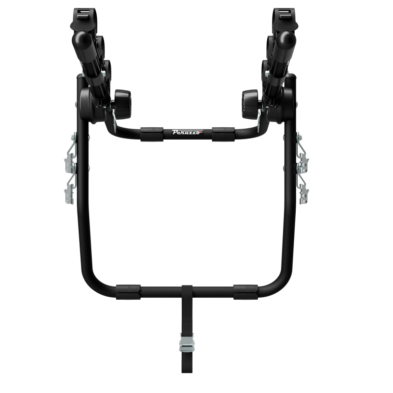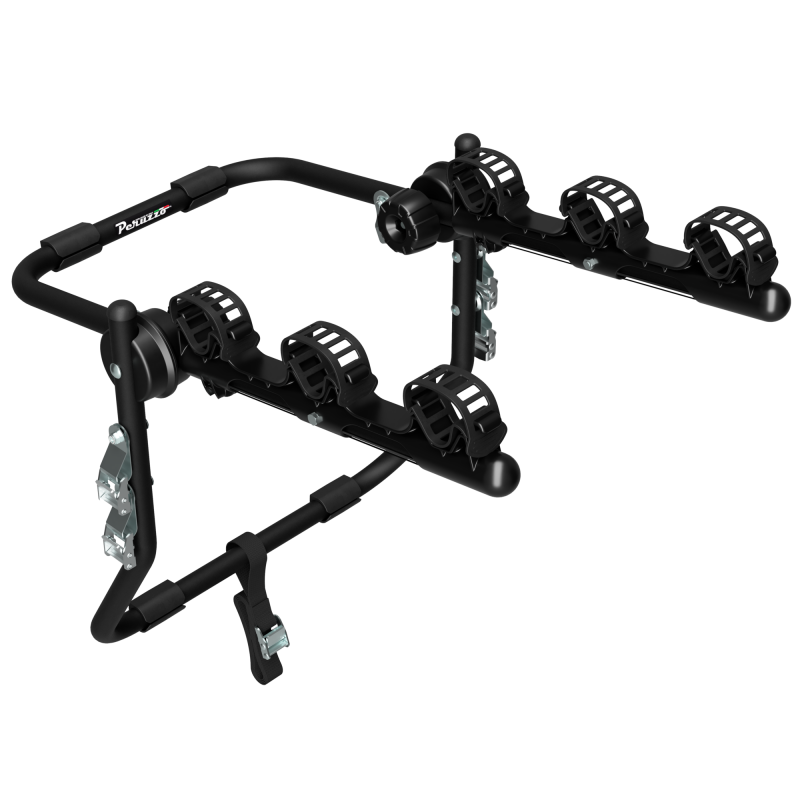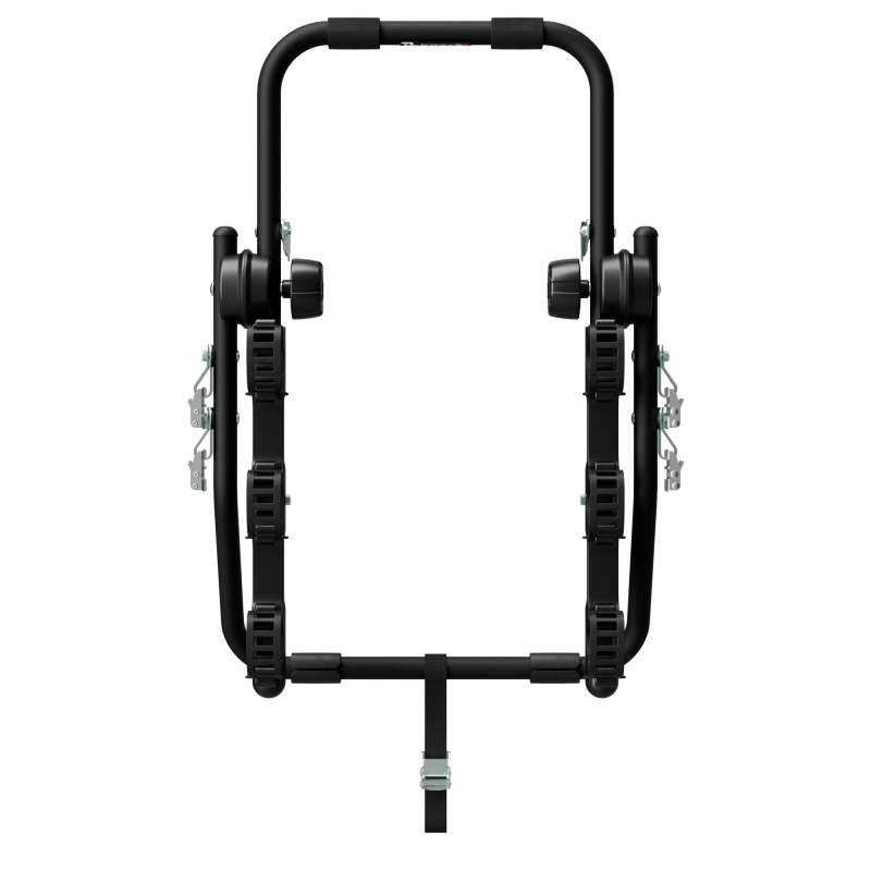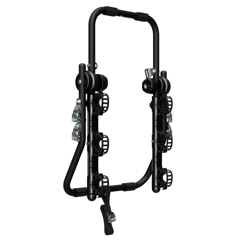 The rear bike carrier Cruiser Delux has a schock absorbing frame support. It's fully assembled and folds flat for an easy storage. It partially leans on the glass