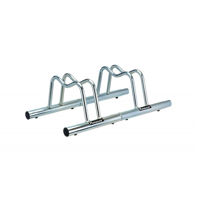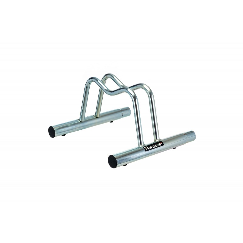 One space grounded-based bike matchable rack in galvanized steel, silver color and black pvc caps. Horizontal tube presents a bottleneck to allow the connection to another alike bike rank.